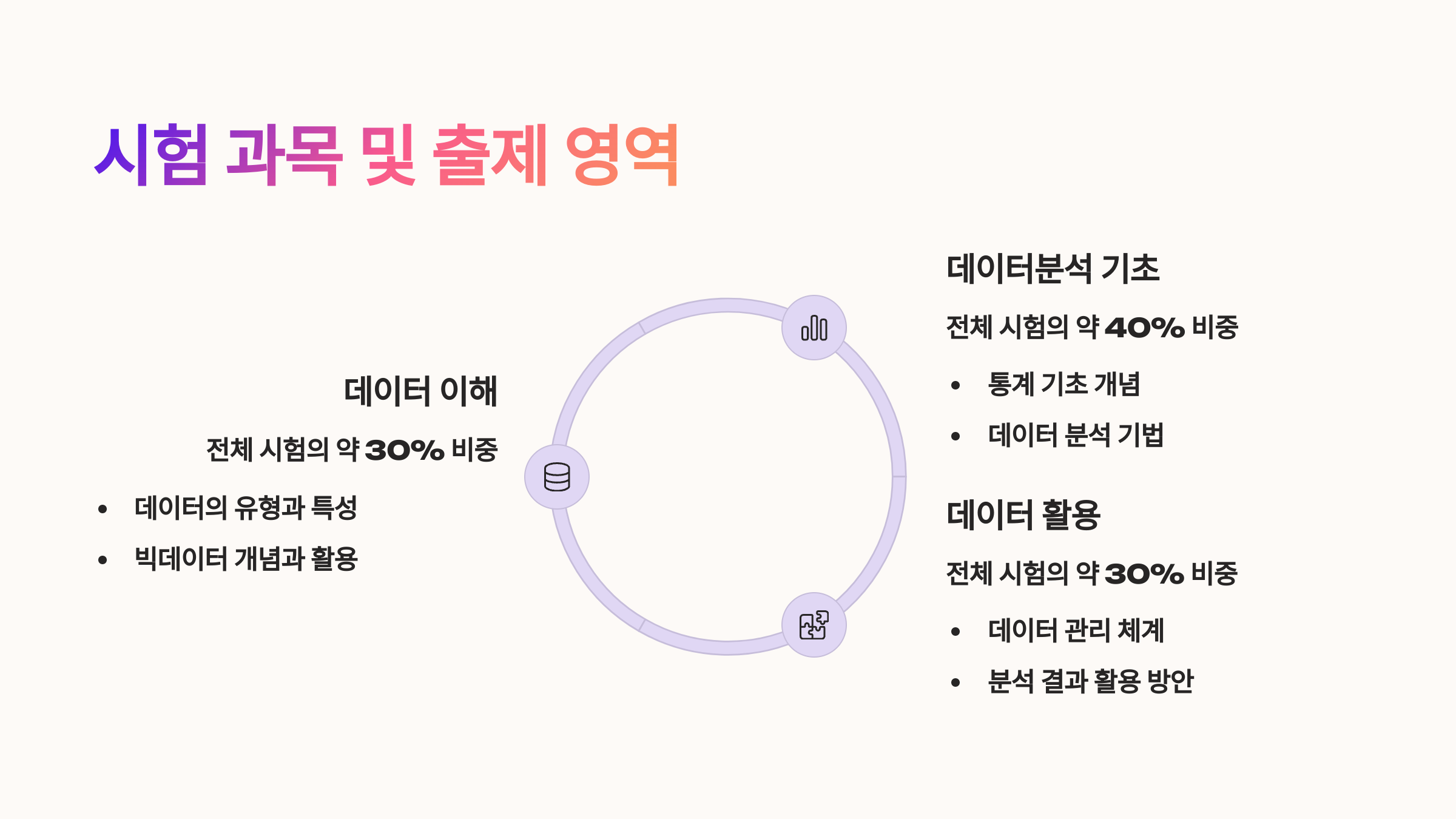 💡 전략: 3과목(데이터 분석)에서 문제 풀이 경험이 중요해요. 기출문제와 해설서를 반복해서 풀면서 용어와 개념을 통째로 익히는 방식이 가장 효율적이에요.