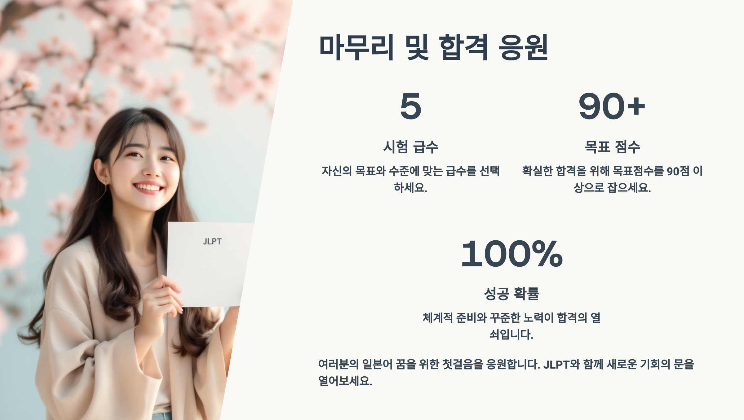 자신의 약점을 분석하고, 시험 구성과 채점 방식을 정확히 파악한다면 JLPT는 결코 두렵지 않아요. 오늘부터 30분이라도 꾸준히 학습한다면, 여러분도 충분히 합격하실 수 있어요! 응원할게요! 🌸📖