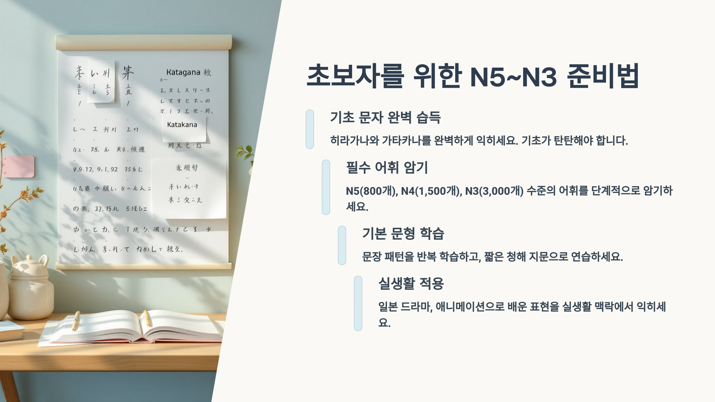 급수별 특징을 정확히 이해하면, 무작정 높은 단계에 도전하는 실수를 줄일 수 있어요. 현실적인 목표 설정이 JLPT 준비의 첫걸음이에요! 👣📅