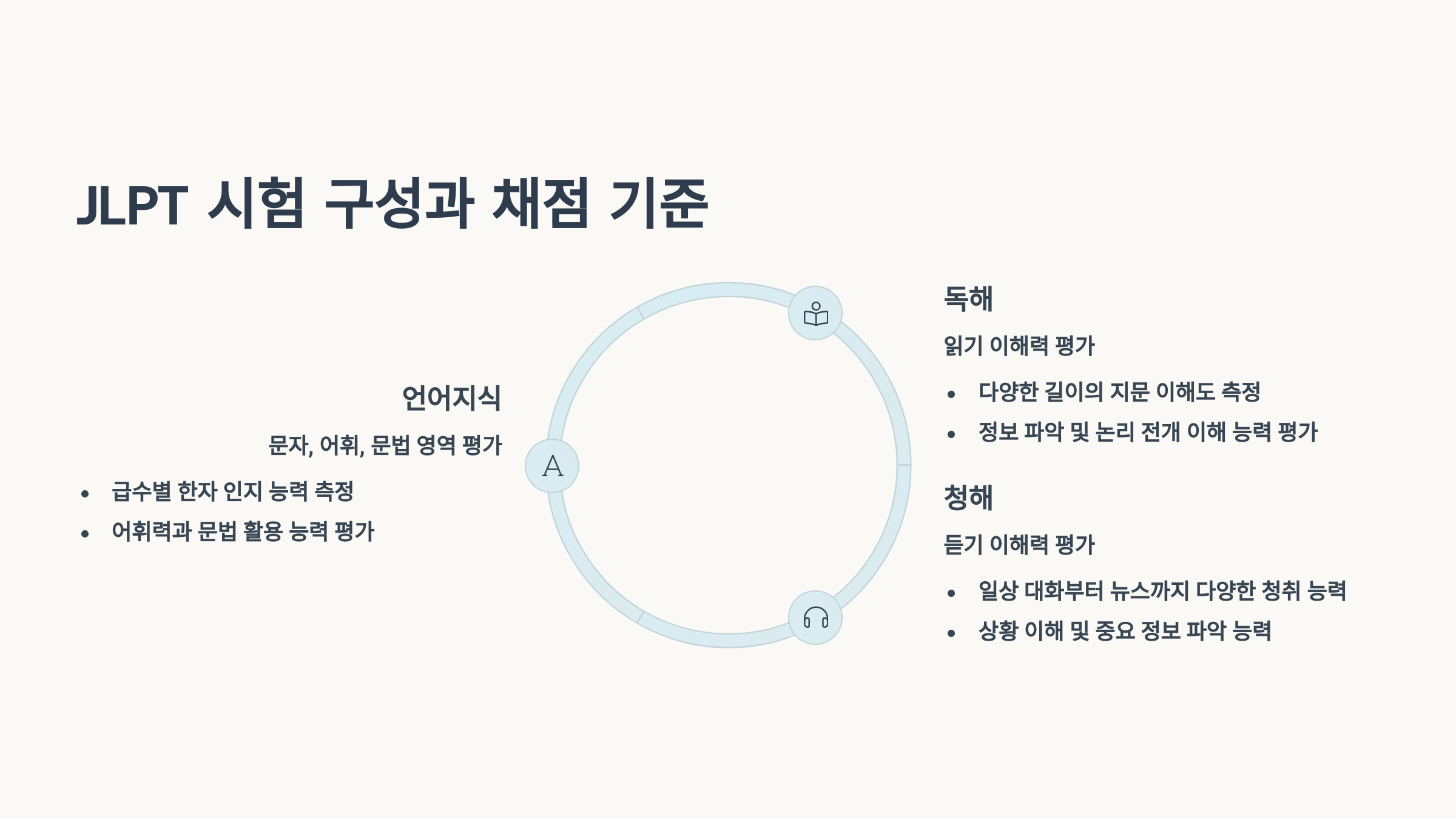 JLPT는 급수에 상관없이 세 가지 영역으로 구성돼 있어요. 바로 언어지식(문자·어휘·문법), 독해, 청해예요. N1~N3는 언어지식과 독해가 통합되어 출제되고, N4~N5는 별도로 구분되어 있어요. 🧩🧠