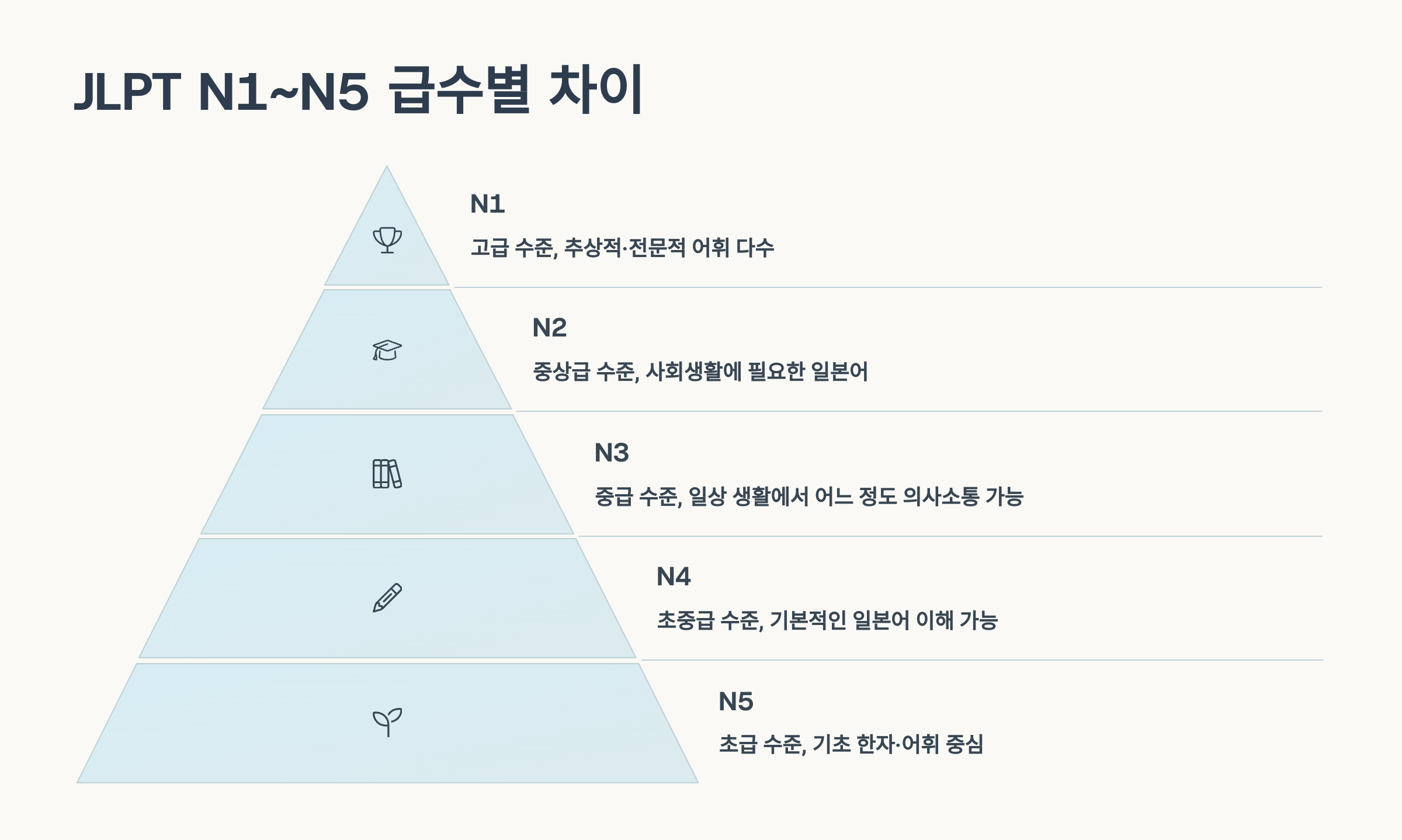 JLPT는 N5부터 N1까지 총 5개의 급수로 구성되어 있고, 숫자가 작을수록 더 높은 난이도를 의미해요. 각 급수는 시험 시간, 출제 유형, 요구되는 어휘 수, 문법 범위 등에서 확연한 차이를 보여요. 🤓📊
