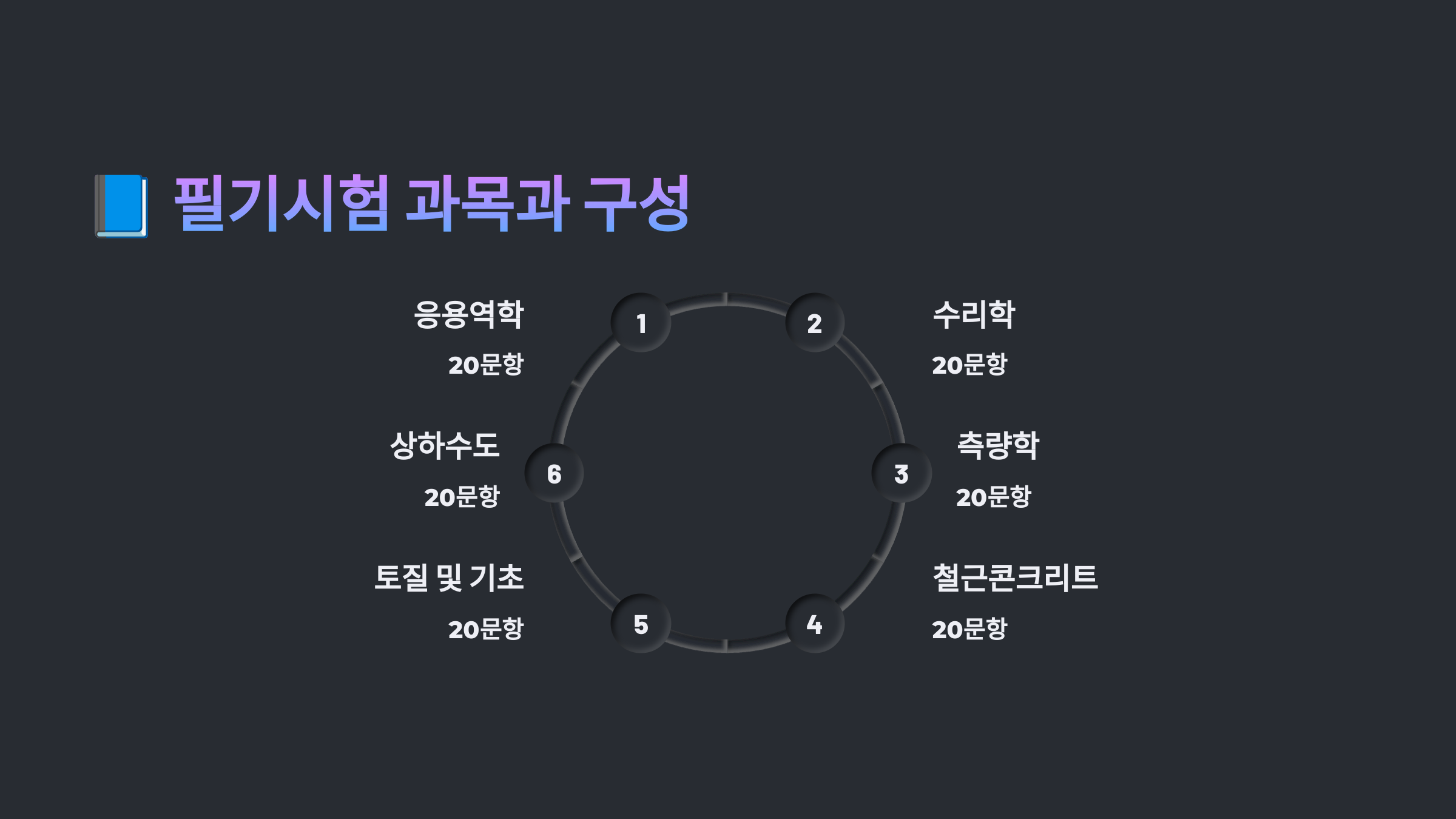 토목기사 필기시험은 총 5과목으로 구성되어 있으며 과목별 20문항, 총 100문항이 출제돼요. 객관식 4지선다형으로 구성되며, 시험시간은 총 2시간 30분이 주어져요. ⏰