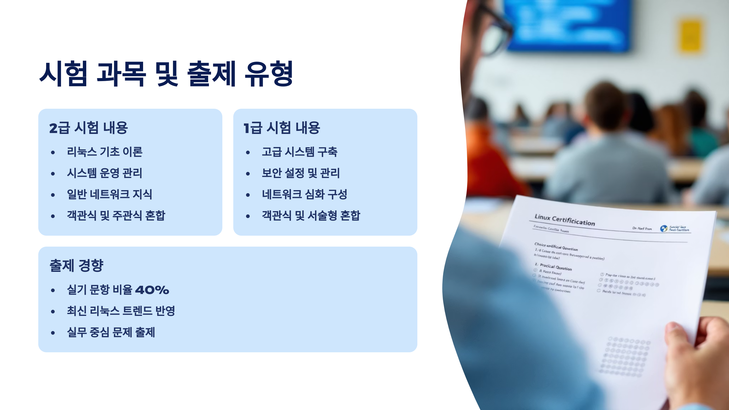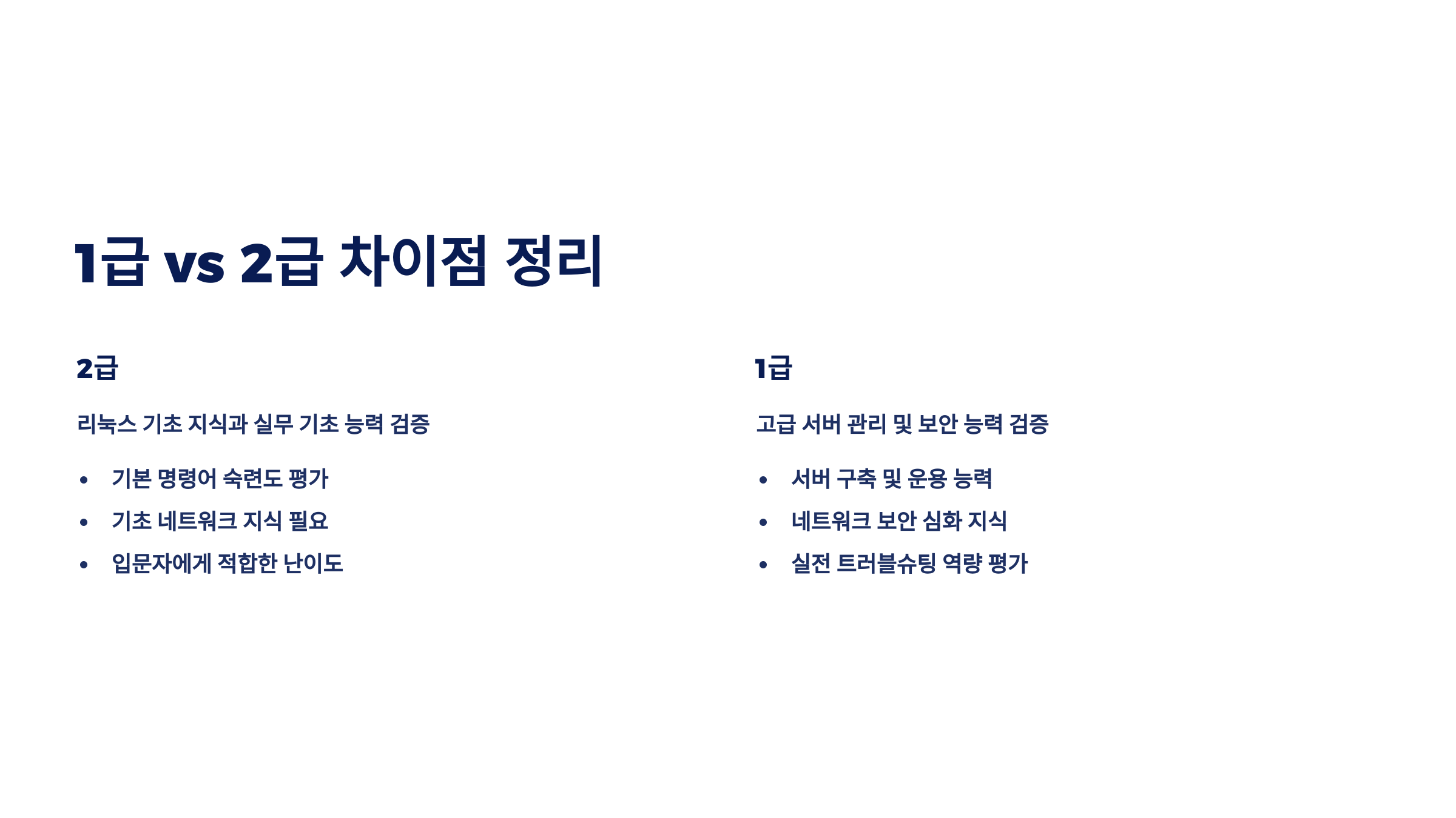시험은 크게 2급과 1급으로 나뉘고, 1급은 중급 이상의 실무 능력을 요구하는 반면 2급은 기본적인 명령어와 시스템 개념을 바탕으로 평가해요. 입문자라면 2급부터 시작하는 걸 추천해요! 🐧