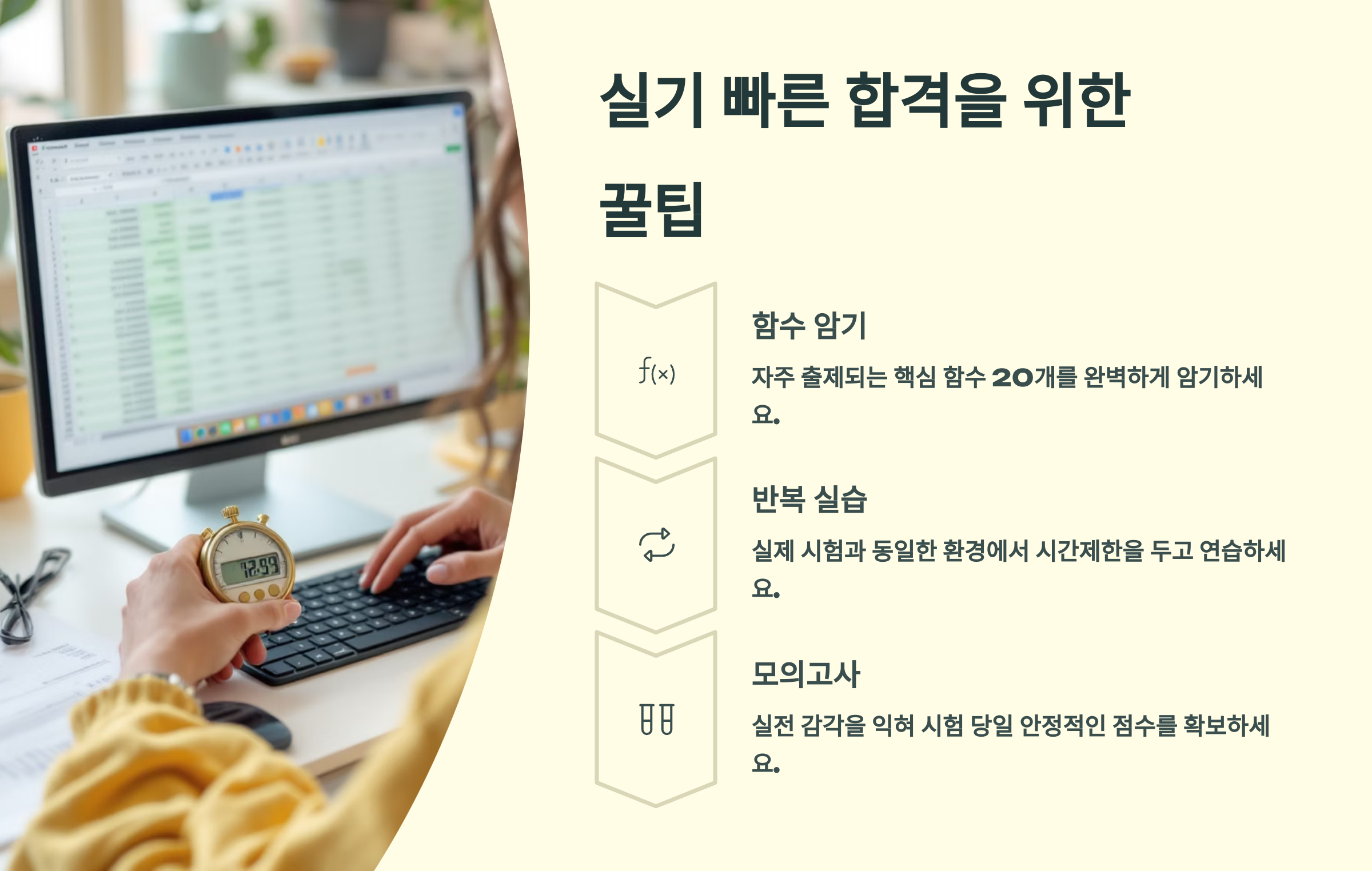 컴퓨터 일반은 이론 위주, 스프레드시트와 데이터베이스는 문제풀이 위주로 시간을 안배해서 공부해야 해요. ⏳