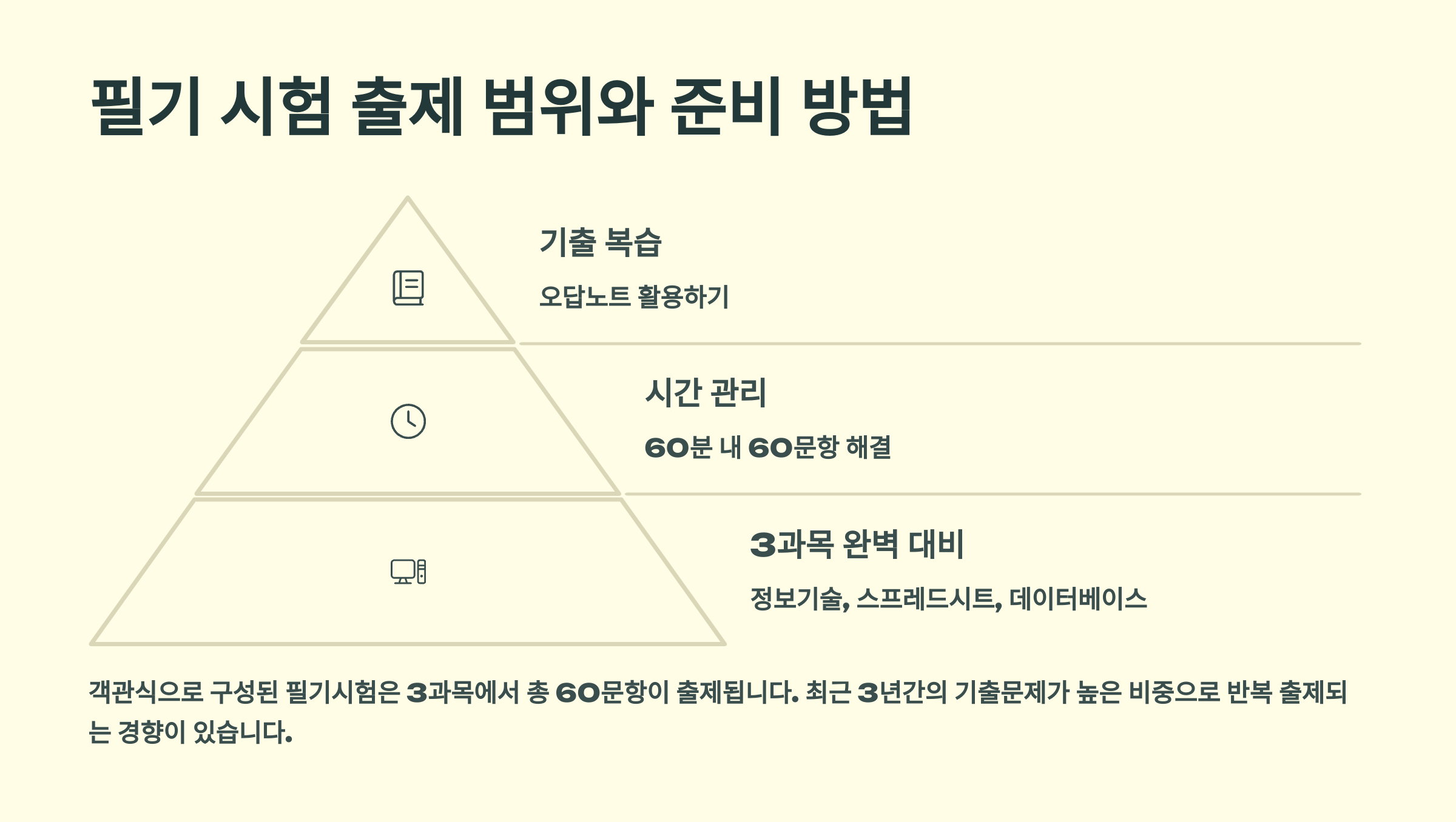 필기 시험은 컴퓨터 일반, 스프레드시트 일반, 데이터베이스 일반 세 과목으로 구성돼요. 4지선다형 객관식 문제로 총 60문항을 풀어야 하죠. 📚