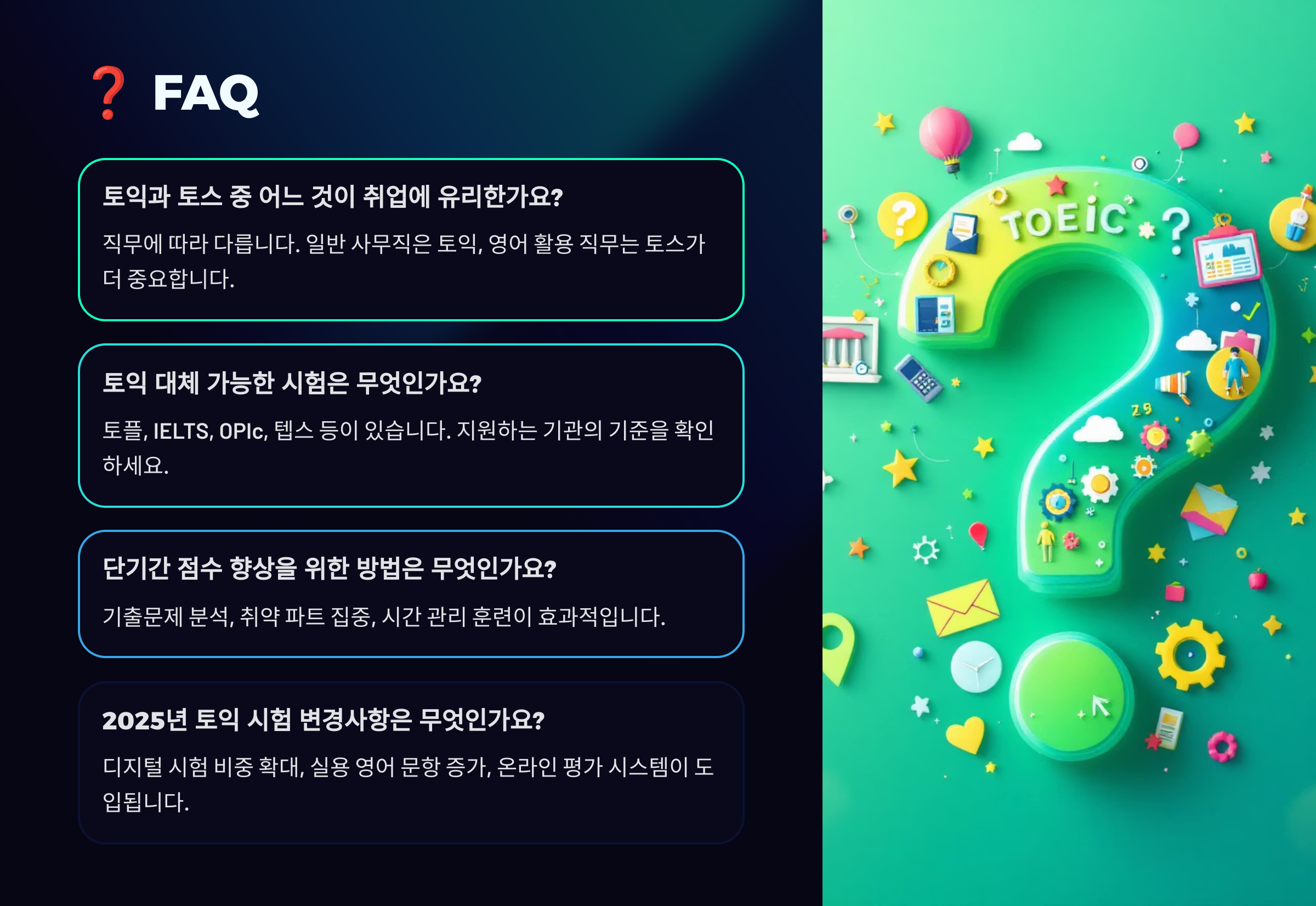 A8. 고득점의 핵심은 시간 안배 + 정확도 + 실전 연습이에요. 특히 RC에서 실수 줄이기와 Part 7 속독 훈련이 점수 상승에 큰 영향을 줘요.