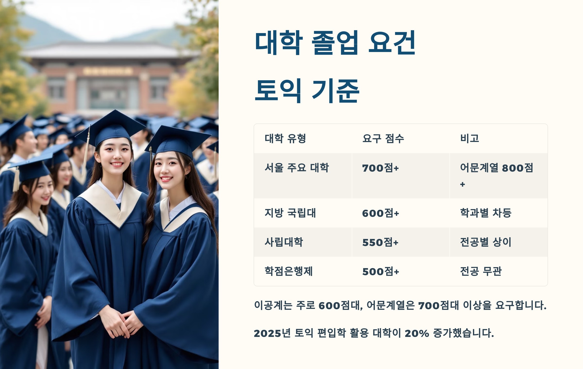 2025년 현재, 국내 대부분의 4년제 대학은 졸업 요건으로 토익 또는 영어 인증 시험 점수를 요구하고 있어요. 그 기준은 학교마다, 학과마다 조금씩 달라요. 😊