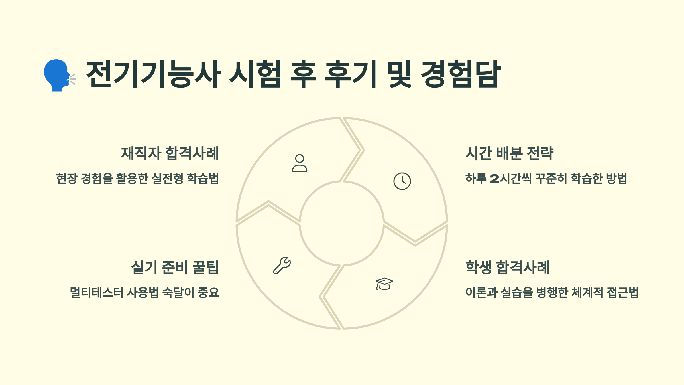 세 번째 후기는 시간 관리의 중요성에 대한 이야기예요. 한 수험생은 "실기시험을 준비할 때 시간 관리 연습을 충분히 했어요. 시험 중 시간이 부족하지 않도록 연습하는 것이 중요한 것 같아요"라고 이야기했어요. 실제 시험에서는 주어진 시간 내에 작업을 마쳐야 하기 때문에, 시간 관리는 매우 중요해요. 특히 실기시험에서는 기기 점검이나 배선 작업을 하는 데 시간이 많이 걸리므로, 미리 연습을 통해 시간을 분배하는 방법을 익혀야 해요. ⏱️