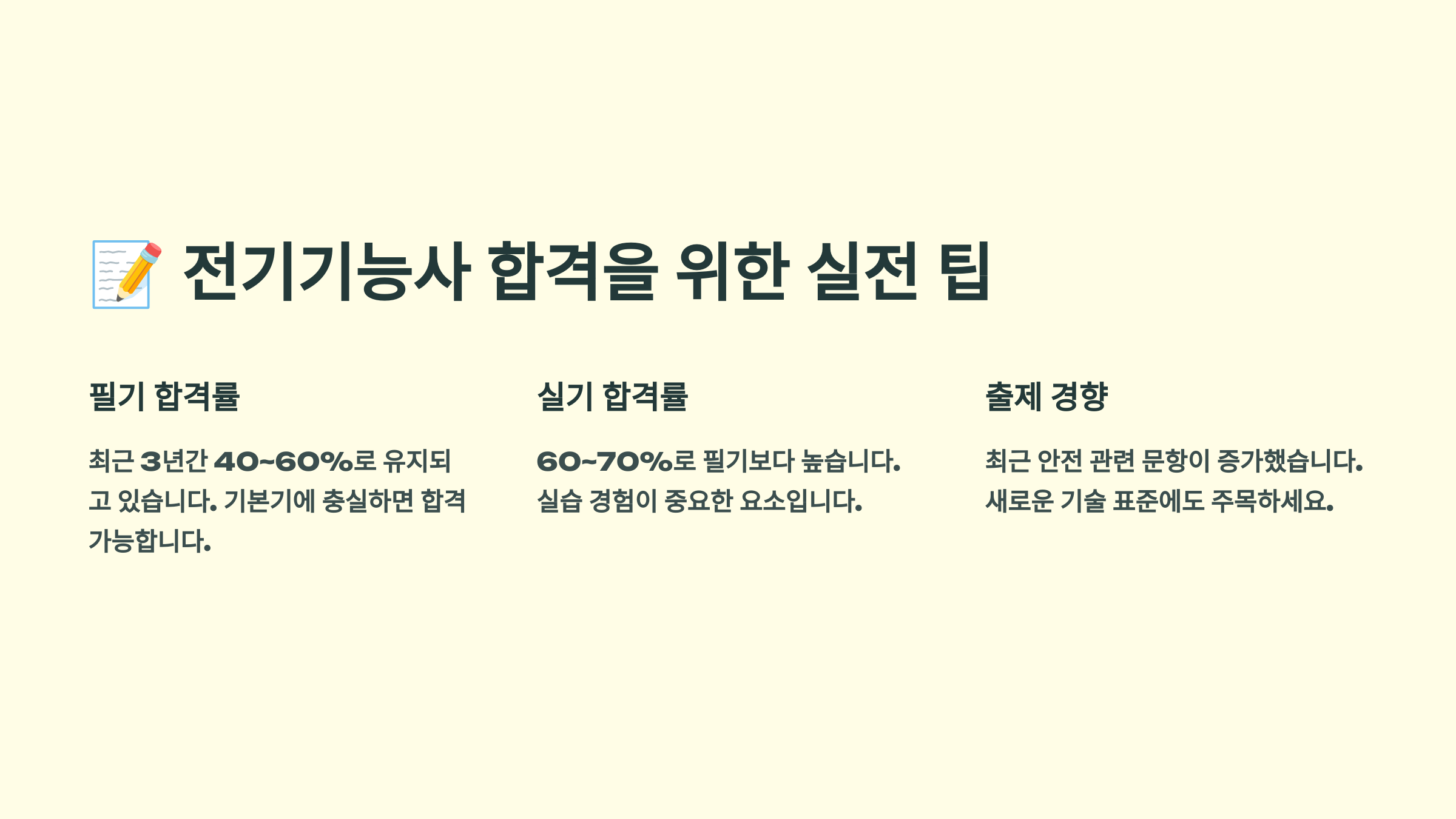 이 실전 팁들을 잘 기억하고 시험을 준비하면, 전기기능사 시험에서 성공할 확률이 높아져요. 준비가 철저하다면 어떤 상황에서도 자신감을 가지고 시험을 볼 수 있을 거예요. 시험 당일, 잘 준비된 상태에서 도전해보세요! 🚀