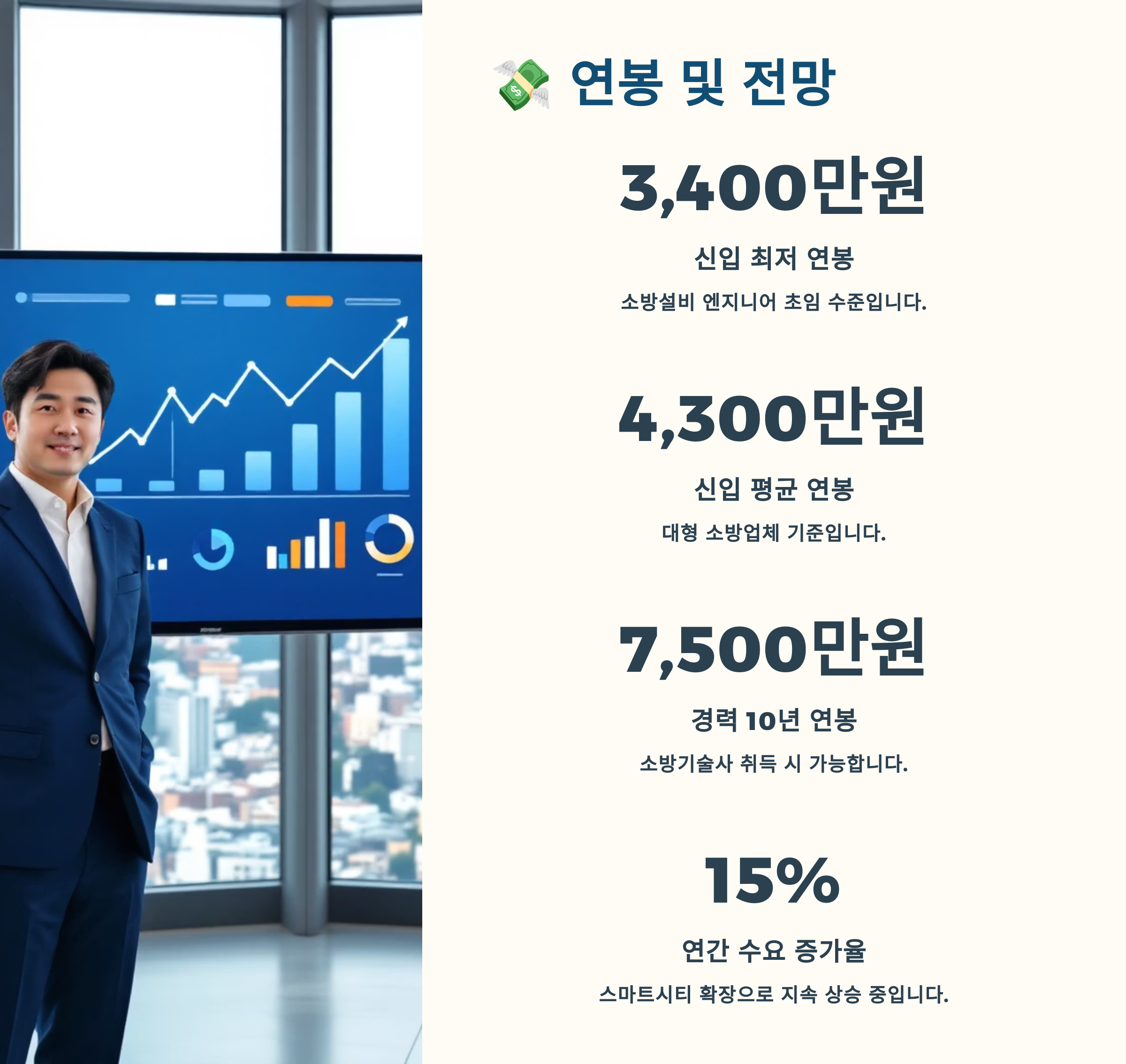 💰 소방설비기사 자격증을 취득하면 경제적으로도 꽤 매력적인 직무를 가질 수 있어요. 기본적으로 기술직군으로 분류되기 때문에, 경력과 숙련도에 따라 연봉 상승 여지가 크고, 안정적인 수익이 가능하답니다!
