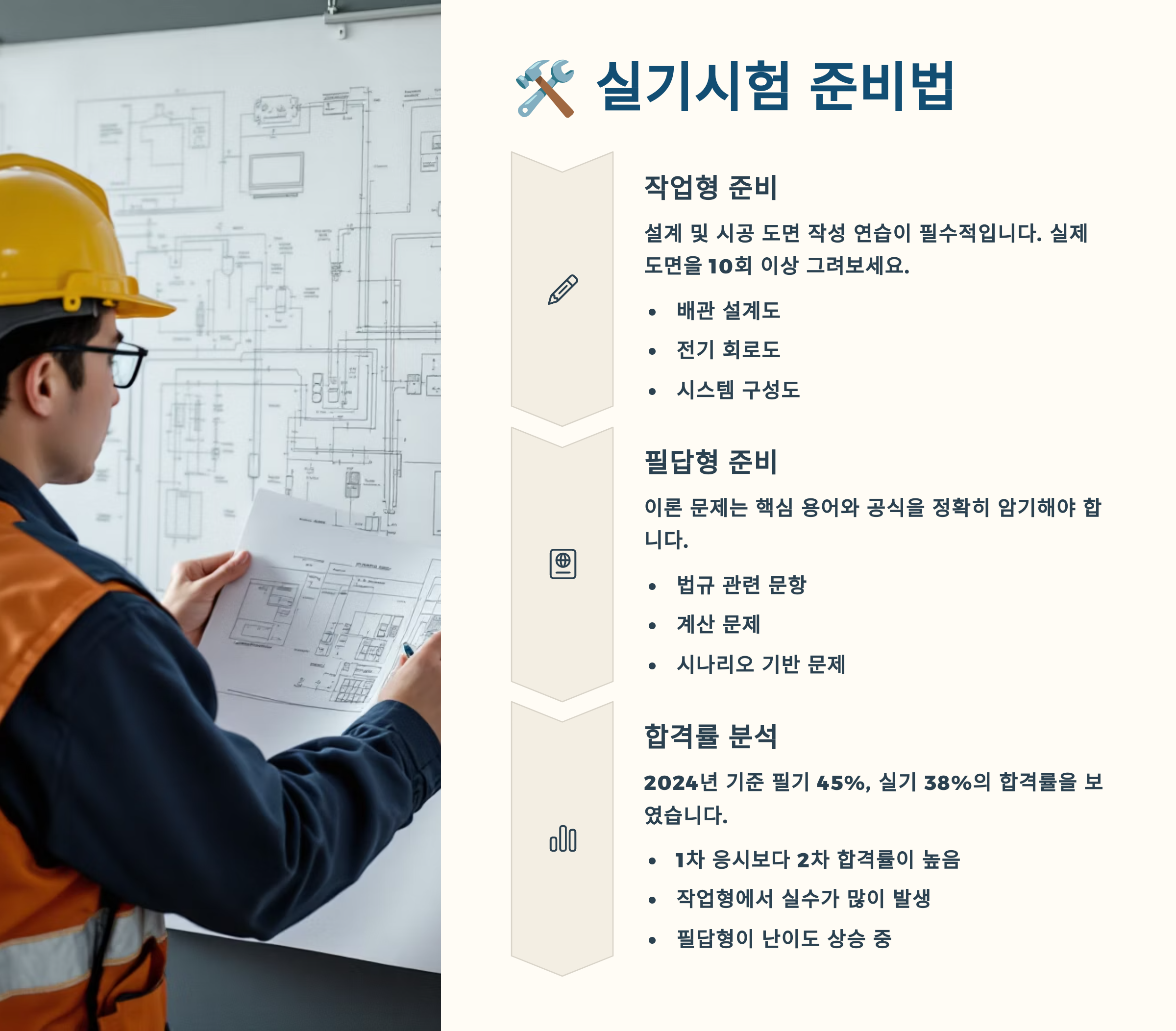 💡 또 하나의 팁! 전기 분야는 수식 계산이 많고, 기계 분야는 도면 이해도가 중요해요. 따라서 전기는 계산문제 중심으로, 기계는 구조도와 배관 배치 이해 중심으로 학습해야 해요. 특히 실기에서는 실제 배관 설계나 장비 명칭을 직접 묻는 경우도 많아요.