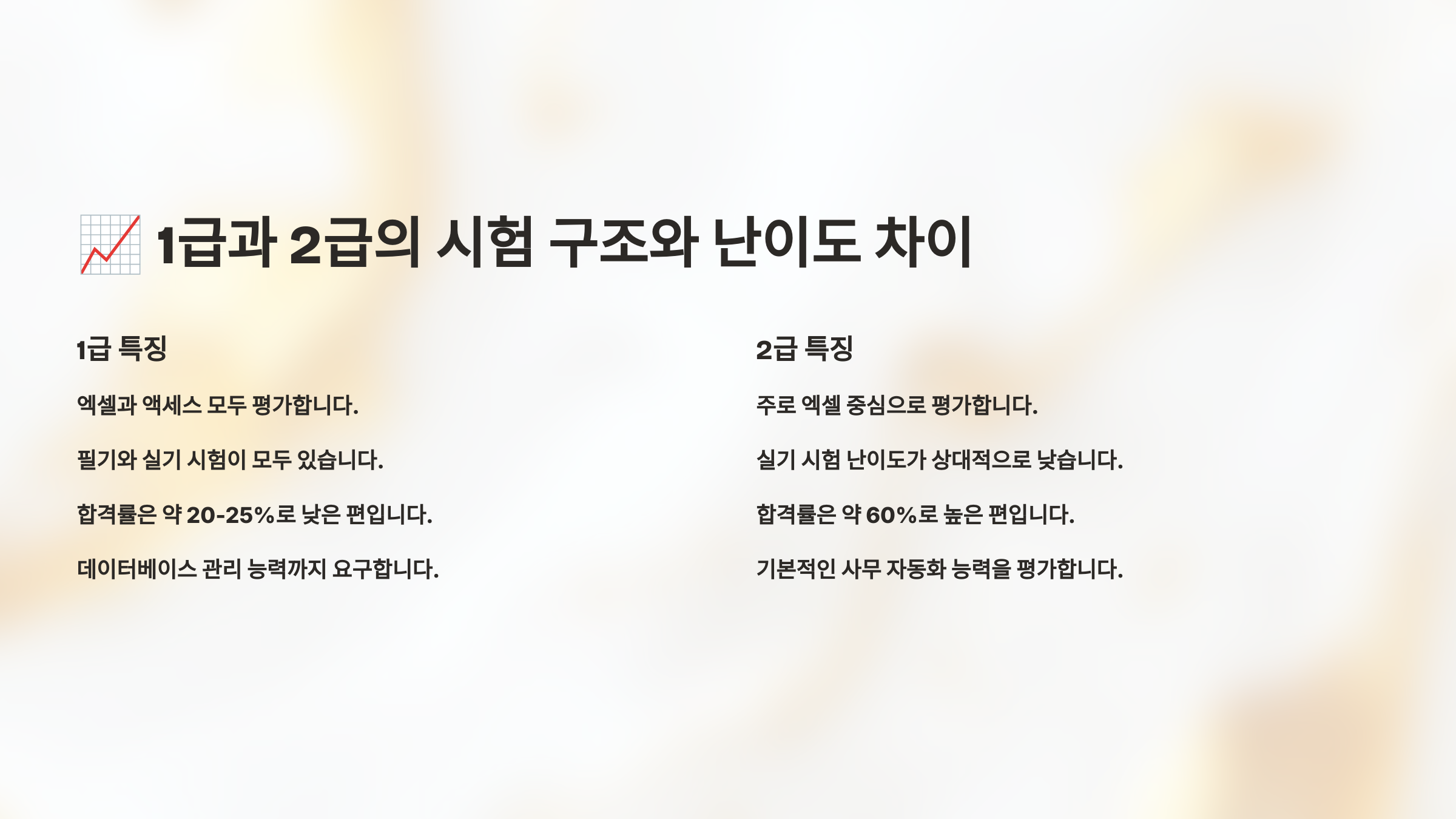 다음은 두 번째 섹션 📈 1급과 2급의 시험 구조와 난이도 차이 두 자격증이 어떻게 다른지 본격 비교해줄게요! 📊