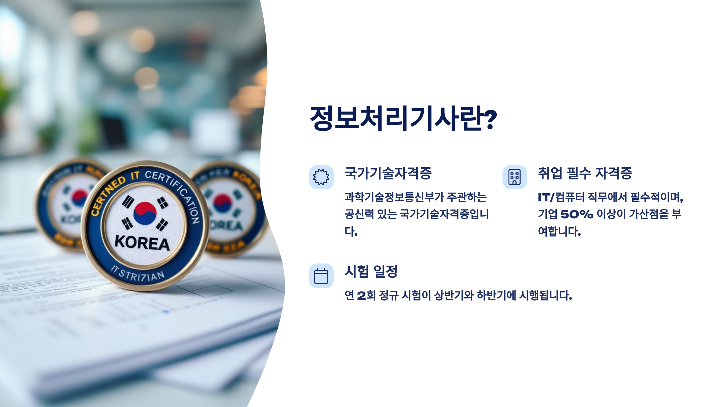 🎯 이 자격증은 IT 전공자뿐만 아니라 비전공자에게도 기회가 열려 있어요. 컴퓨터 구조, 네트워크, 데이터베이스 관리 같은 전반적인 IT 기초 지식을 평가하고, 실기에서는 SQL 작성, 시스템 분석 설계 등 실무 능력까지 함께 검증해요.