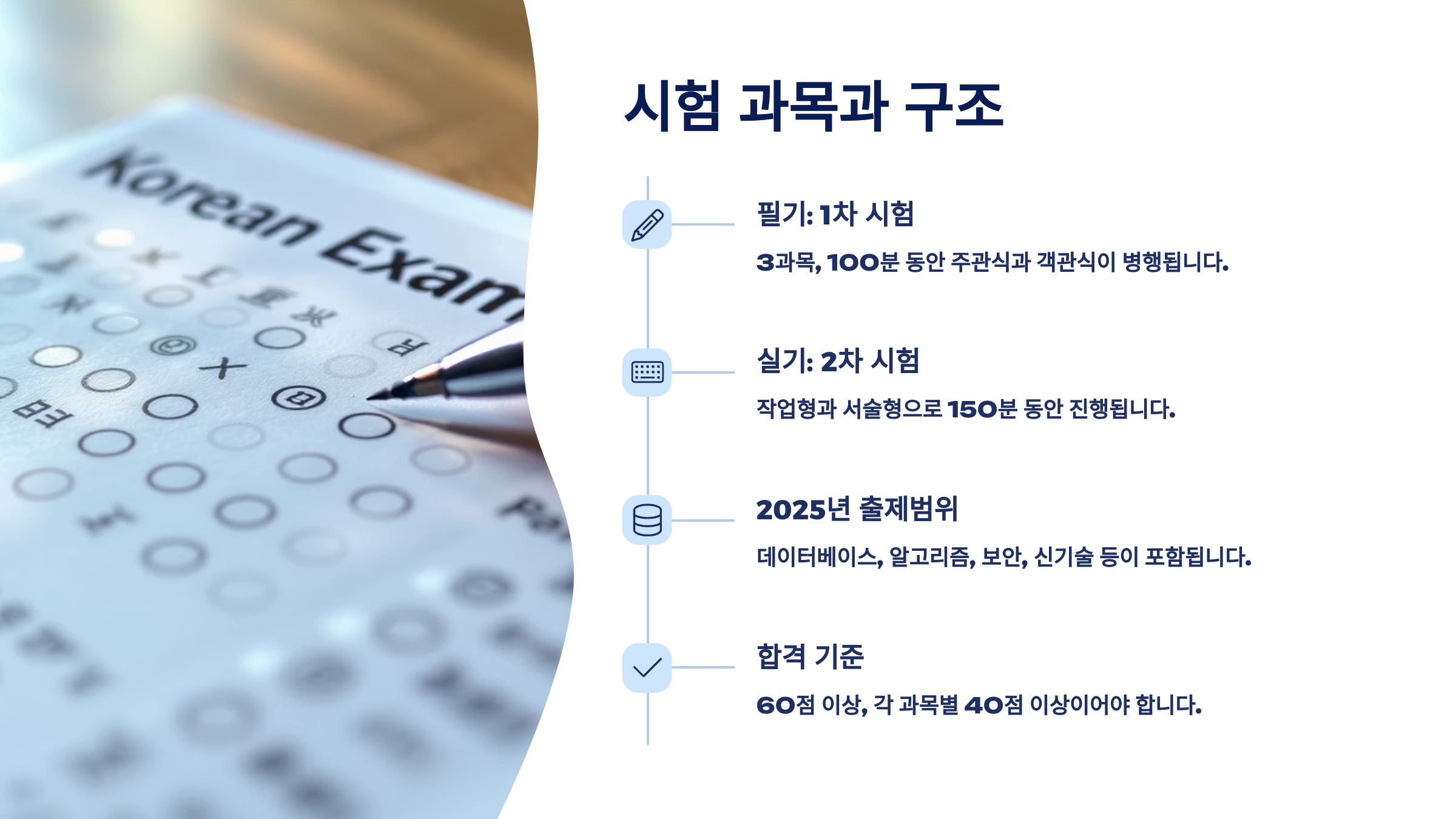 🛠 실기는 데이터베이스(SQL), 프로그래밍, 시스템 구축 문제를 해결하는 실무형 문제가 출제돼요. 최근 트렌드는 단순 암기가 아니라 '실제 코드 작성' 능력 중심으로 바뀌었어요!