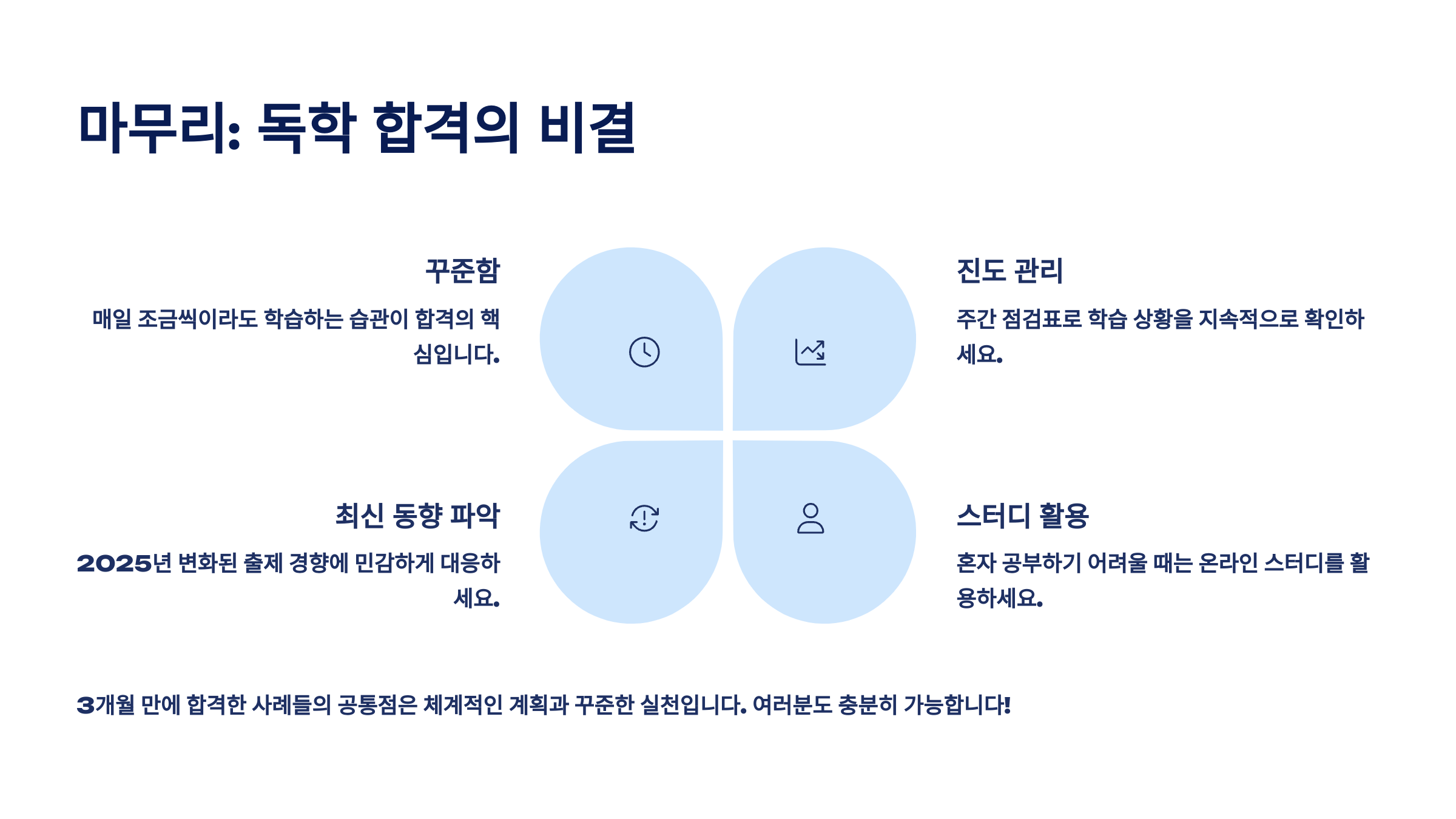 👉 실전처럼 시간을 재고 문제를 풀어보는 연습이 정말 중요해요. 실제 시험은 긴장감 때문에 평소보다 시간이 훨씬 빨리 가요. 2~3회 모의고사 경험은 필수!