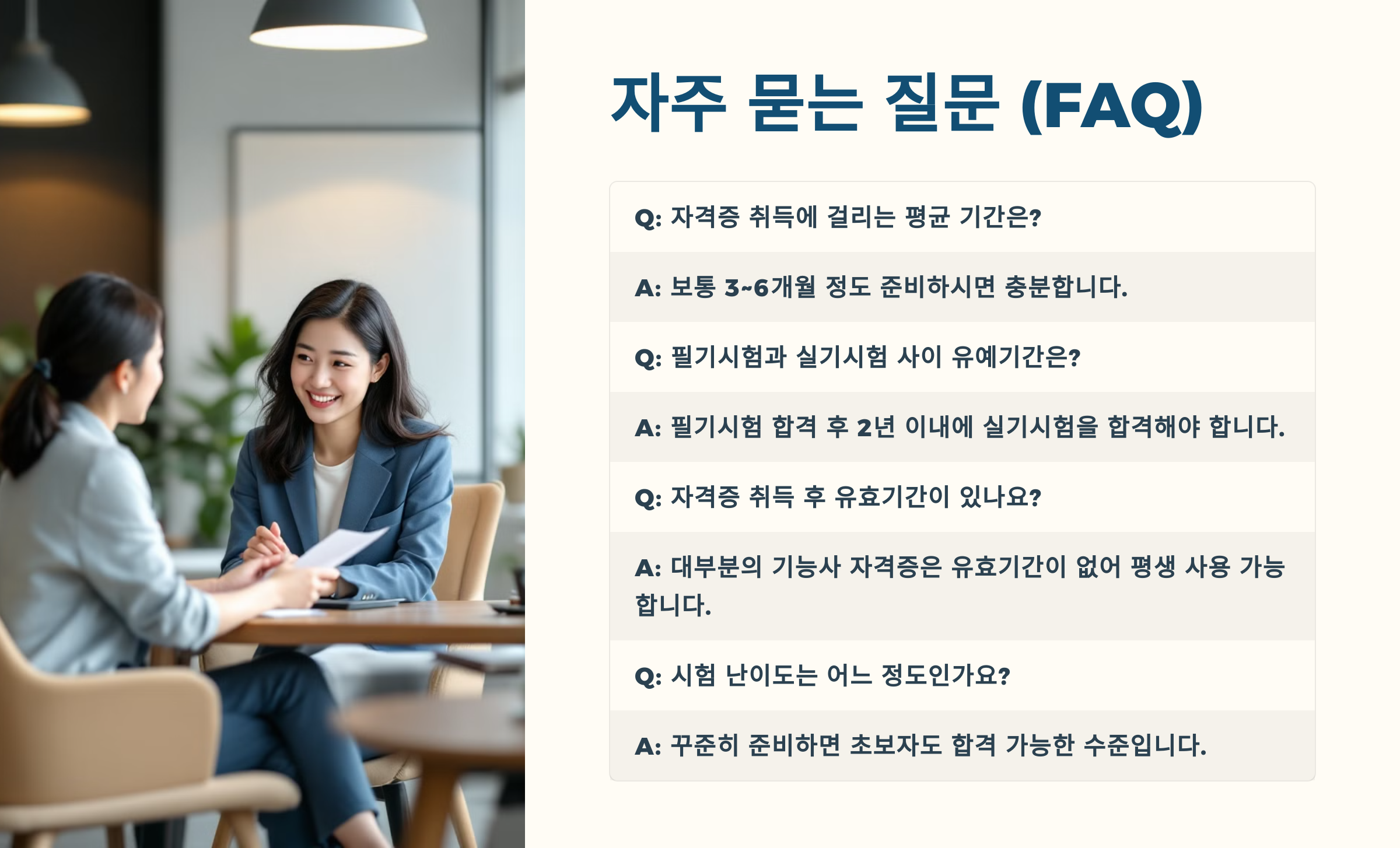 A8. 기능사 자격증은 평생 유효해요! 단, 현장이나 공공기관에선 최근 취득 여부를 보는 경우도 있으니 참고하세요.
