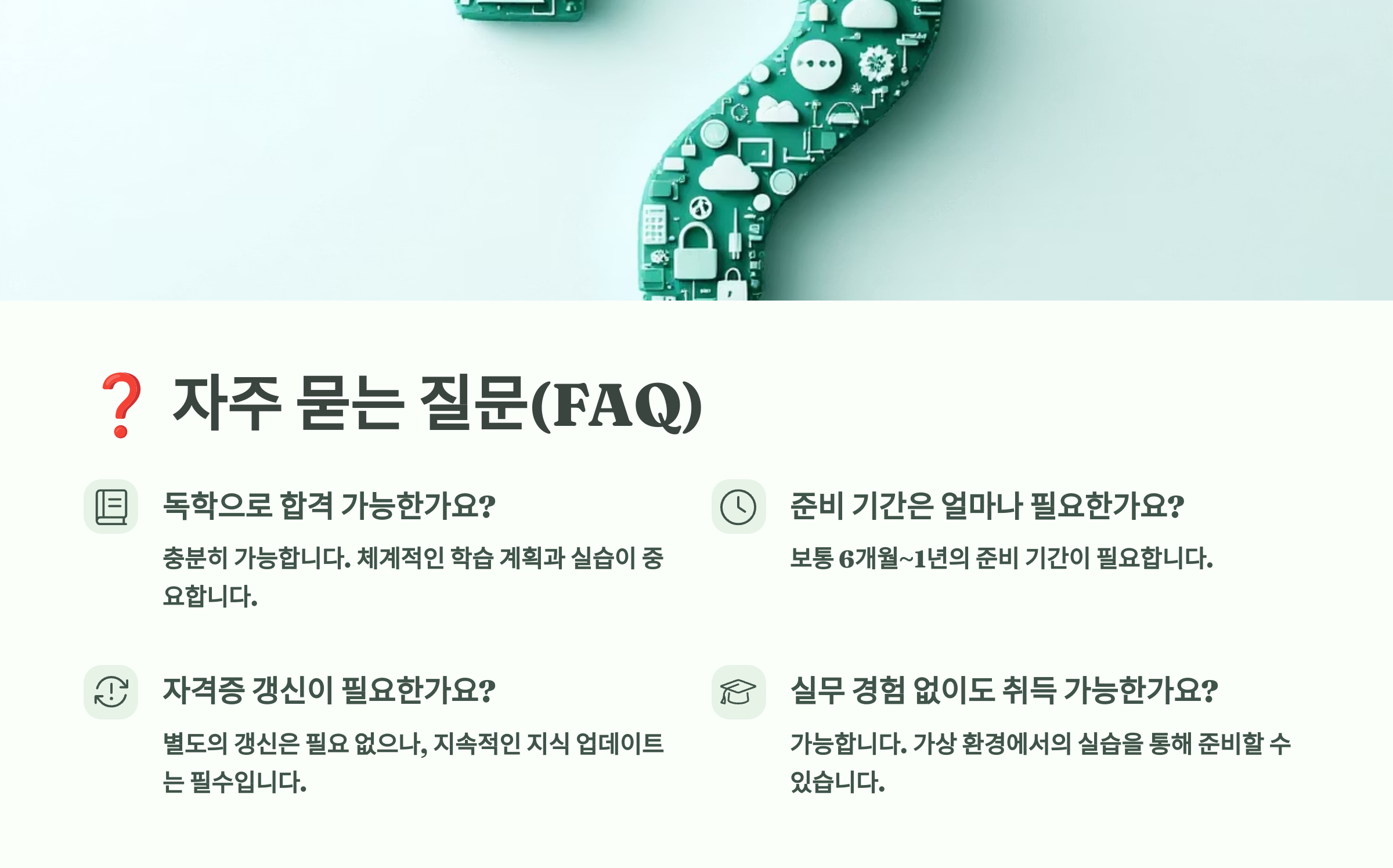 자격증은 단순히 종이 한 장이 아니라 보안 지식을 실무에서 적용할 수 있는 능력의 증명이에요! 다음은 많은 분들이 궁금해하는 ❓ 자주 묻는 질문(FAQ)을 모아 정리해드릴게요! 🗂️