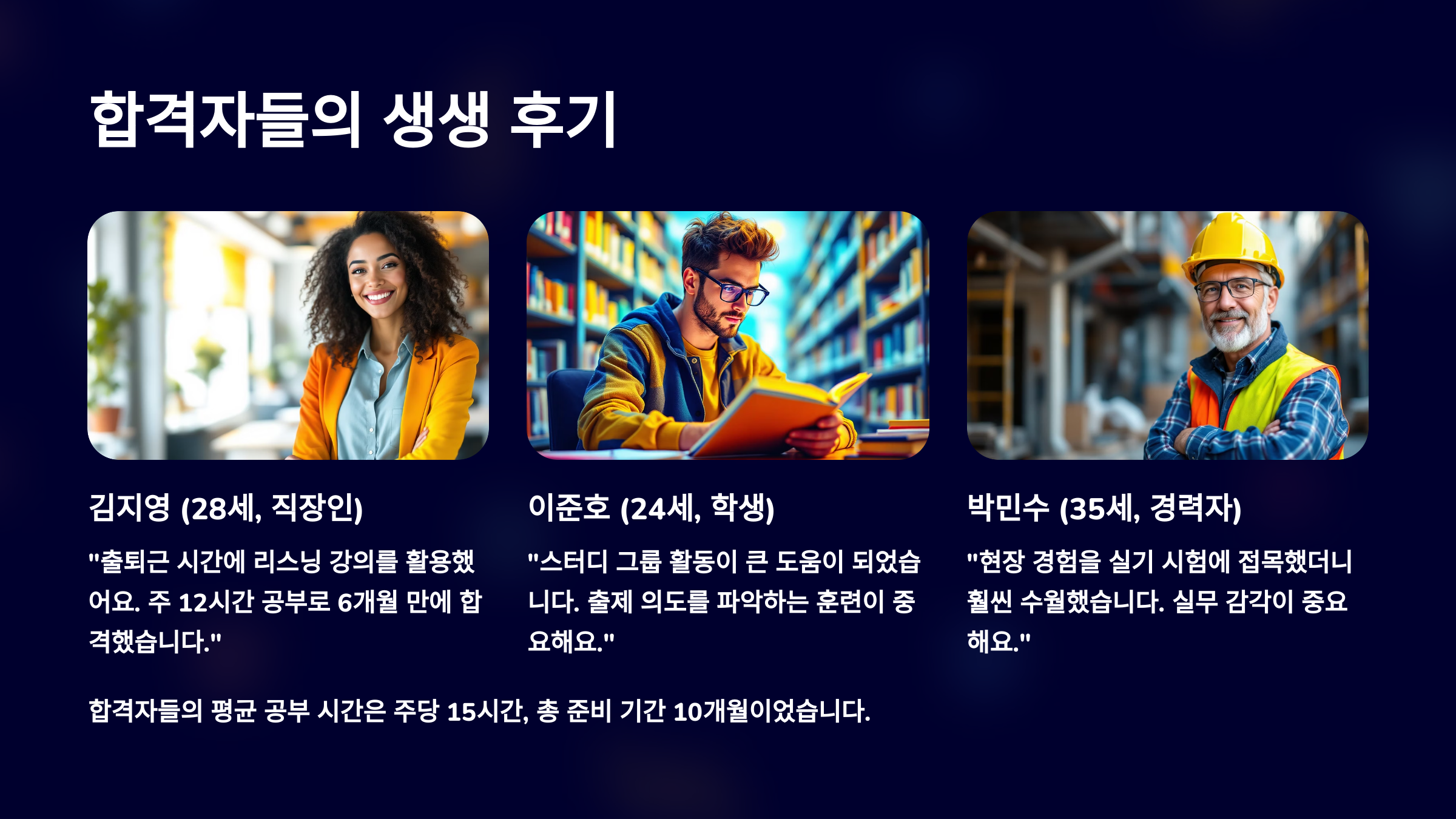 “퇴근 후 2시간씩 공부했습니다. 핵심은 기출 문제 3회독이에요. 필기보다 실기가 더 어렵게 느껴졌는데, 기출 문장을 외워서 직접 써보는 연습이 정말 효과 있었습니다. 작성형은 키워드 놓치면 감점 크더라고요!”