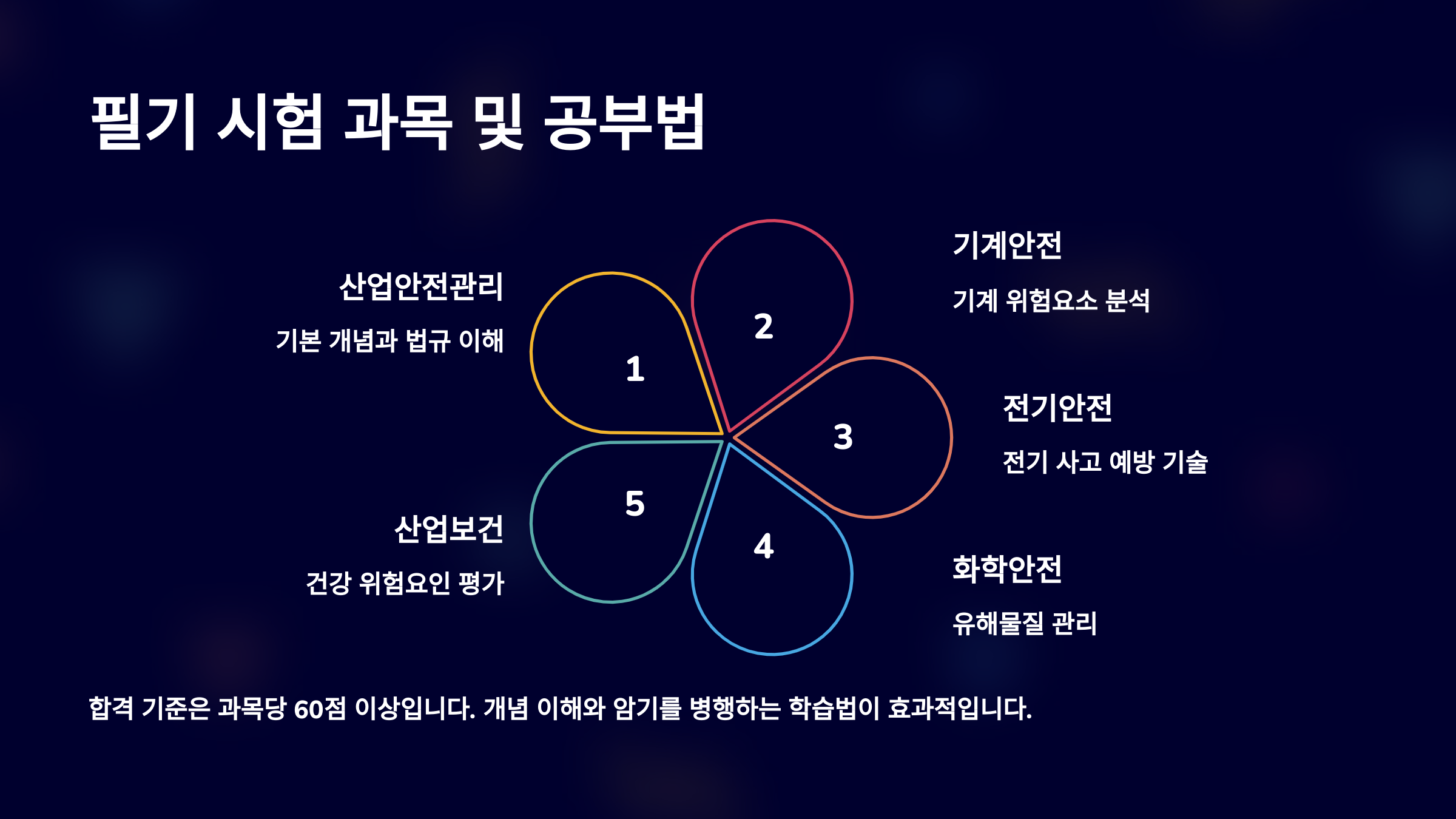 산업안전기사 필기시험은 5과목 총 100문항으로 구성되어 있어요. 객관식 4지선다형 문제이며, 60점 이상이면 과목 단위 없이 전과목 합산으로 합격이에요. 📝